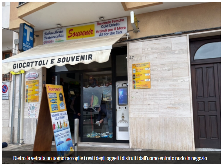 La situazione è precipitata quando l'uomo, nudo, si è introdotto in una tabaccheria della zona distruggendo oggettistica e souvenir, ribaltando frigoriferi porta bibite e scagliandosi contro il proprietario con calci e pugni al volto e al torace.